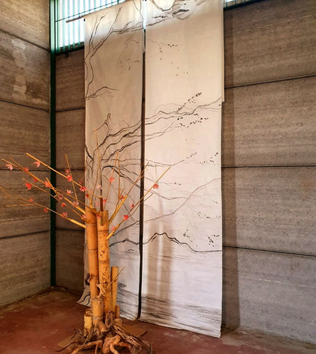 Les tiges de bambou permettent de pendre la peinture à un mur grâce à de solides liens. (voir croquis n.14)